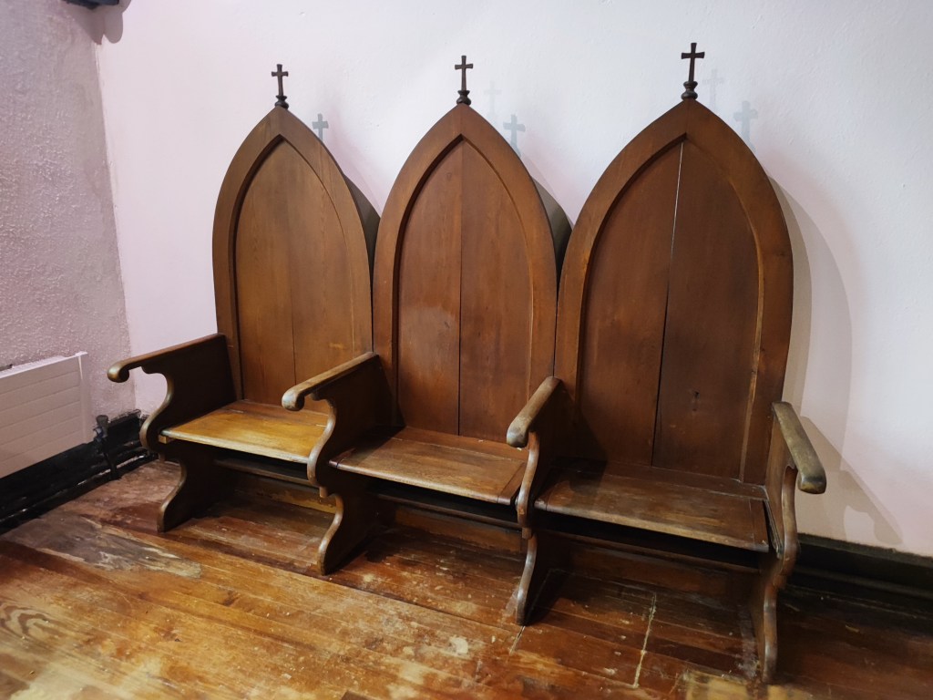 Originally, there were ten of these beautiful oak chairs in the chapel, arranged neatly along each wall — as shown in the historic photograph below. Today, only one of these original chairs remains.