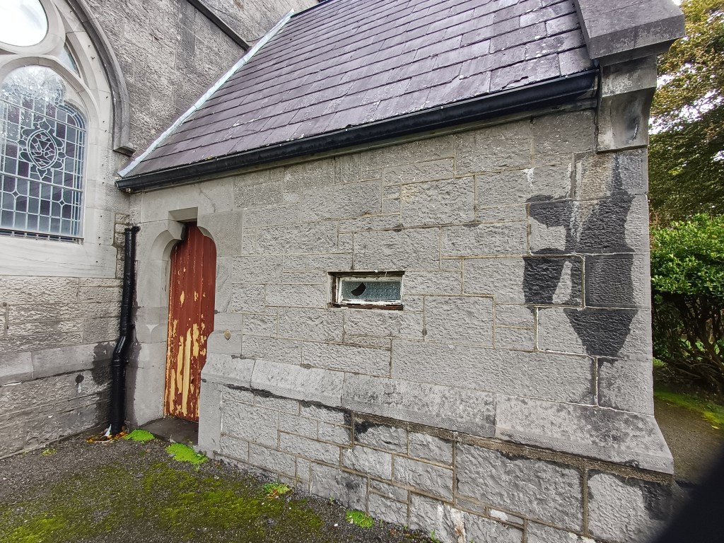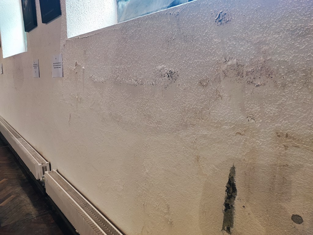 The following photographs show a newly painted interior chapel wall In December 2024 and then within 10 months, water damage of the same wall caused by water ingress through the limestone walls, because of damaged downpipes and gutters. The support given by the Heritage Council has stopped this water damage.