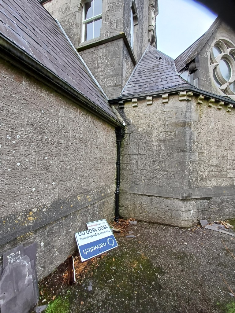 The following photographs show the restored and replaced cast iron downpipes and guttering financially supported by the Heritage Council.