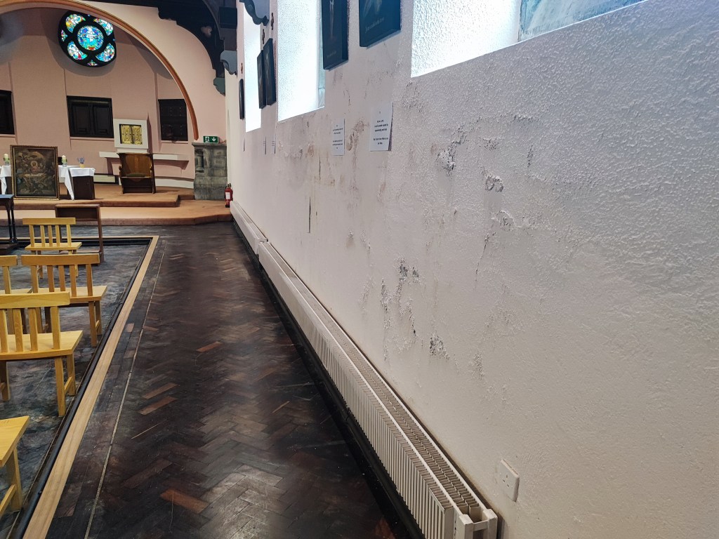 Photograph above: Water damage on the chapel walls. Thanks to funding from the Heritage Council, this problem has been fixed..
